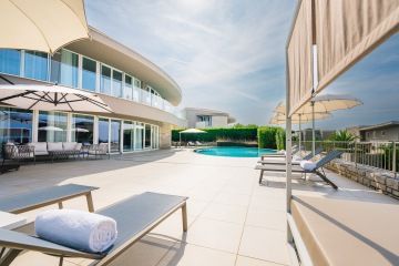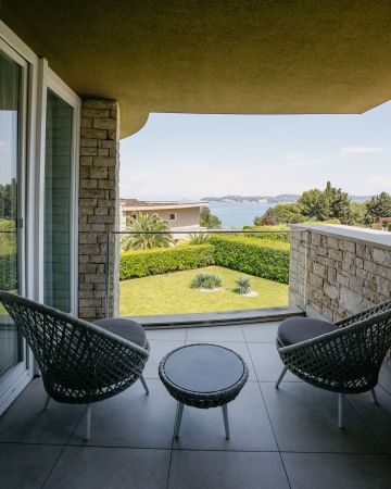 Multiple master suites in each villa offer king-size beds, high-quality linens, and private balconies or terraces with views of the garden or sea. In select rooms, the view stretches all the way to the historic town of Piran. Smart TVs, walk-in wardrobes, and spacious layouts ensure both comfort and privacy. The master bathrooms are true private sanctuaries, featuring marble double vanities, rainfall showers, soaking tubs, heated floors, and premium amenities. Additional en-suite bathrooms offer a clean, contemporary design with quality finishes, providing comfort and convenience without compromise. The atmosphere is soft, cool, and restorative, with every detail designed for peace. Some bedrooms and terraces offer sweeping views of the historic town of Piran a reminder of the region’s timeless charm just across the sea.